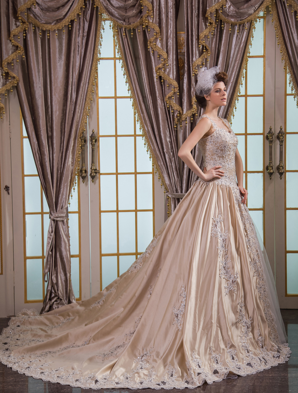 Luxury Champagne Ball Gown Appliques Long Train Wedding Dress