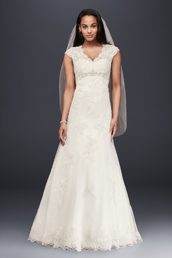 David's Bridal Cap Sleeve Lace Over Satin Wedding Dress with Illusion