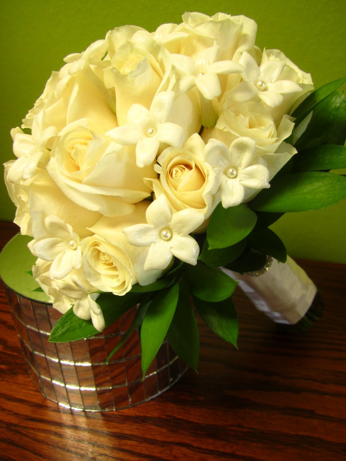 Priscilla’s bridal bouquet White roses with stephanotis And bling